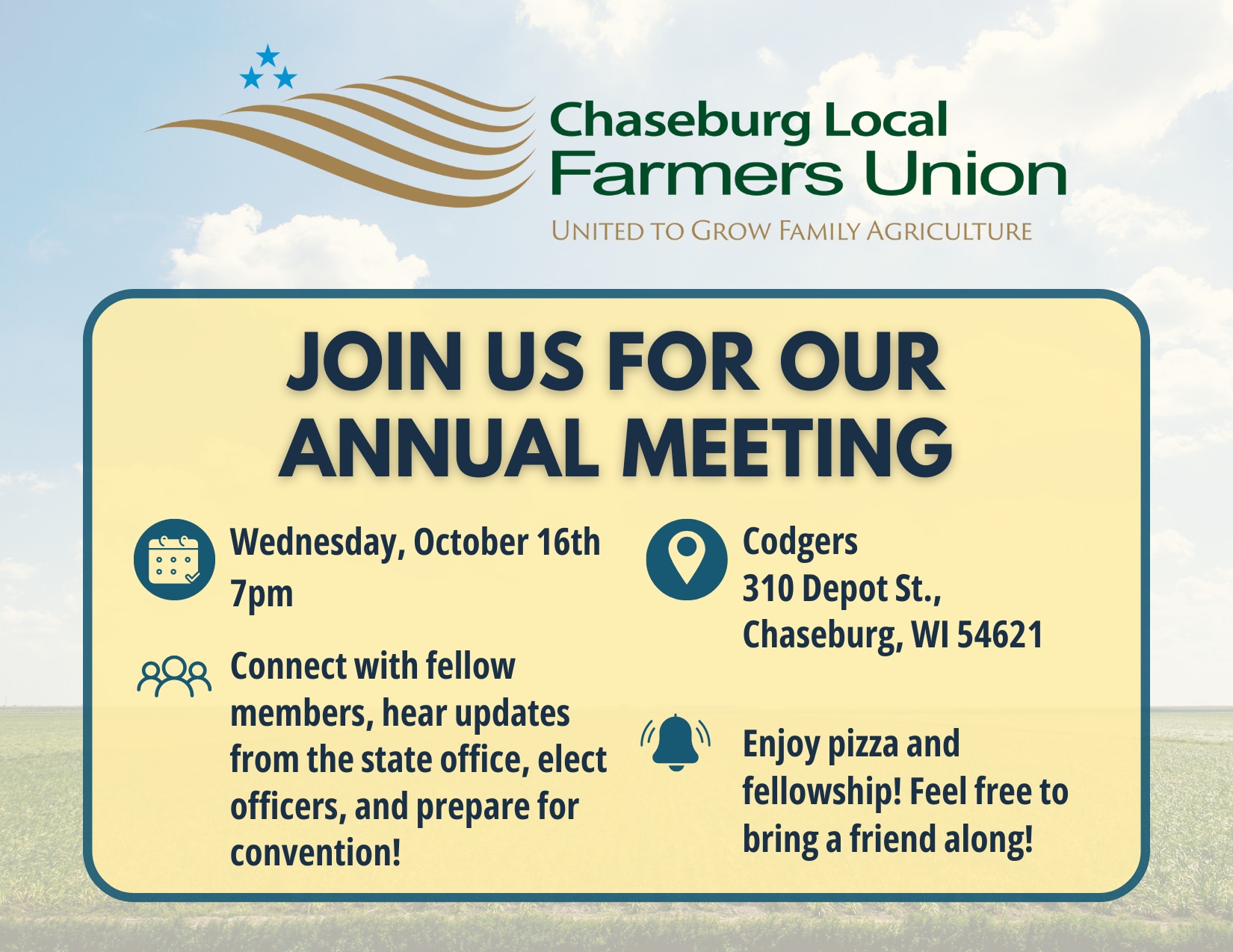 Join the Chaseburg Local Wisconsin Farmers Union Chapter for our annual meeting on Wednesday, October 16th at 7pm!