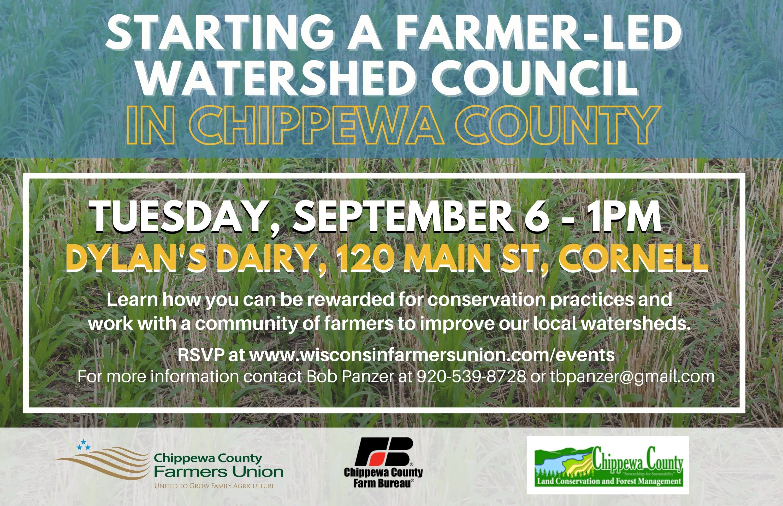 Farmers looking to improve their land and bottom line through the implementation of conservation practices are invited to learn more about a proposed farmer-led watershed council in Chippewa and Eau Claire counties. Farmers, landowners and other interested parties are encouraged to attend the meeting, which will gauge interest in the region. Organized by the Wisconsin Farmers Union, Chippewa County Farm Bureau, Chippewa County Land Conservation, and the Chippewa County Farmers Union, the event will be held at 1pm on Tuesday, September 6th at Dylan’s Dairy, 120 Main Street, Cornell. Farmers throughout Wisconsin strive to be conservation stewards, and many are adopting or expanding practices that improve the quality of soil and water. Learn how you can be rewarded for these efforts and join a community of farmers to increase the overall impact in local watersheds. (To register, please use the gray 'Register for Event' button at the top right of your screen.)