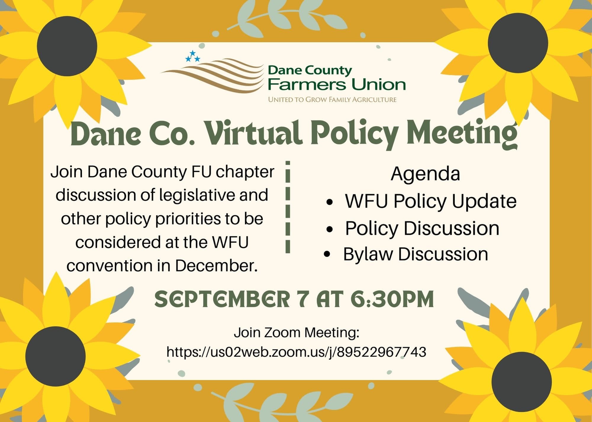 Join Dane County FU chapter discussion of legislative and other policy priorities to be considered at the WFU convention in December This will be a virtual meeting. Please watch your email as the date approaches for the zoom link.