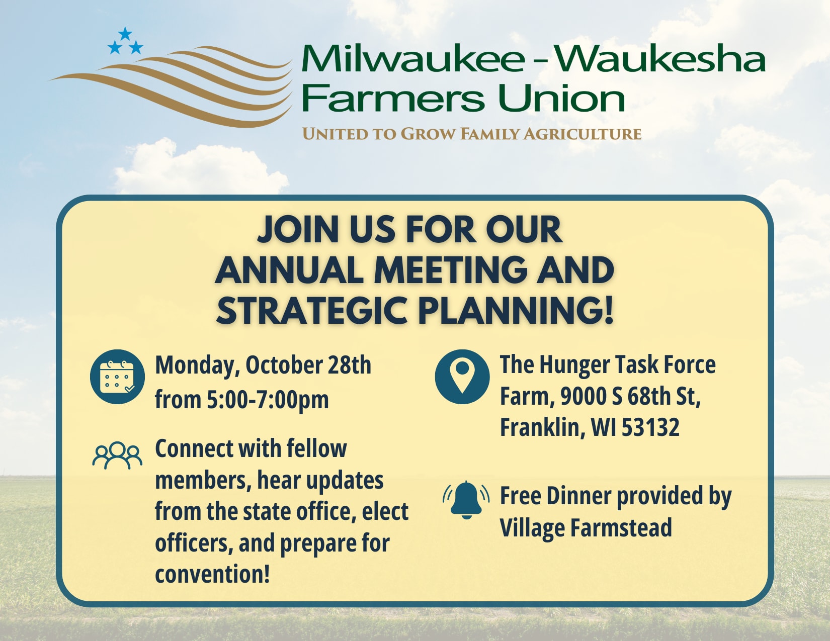 Join the MKE-Waukesha Wisconsin Farmers Union Chapter for dinner and annual meeting, followed by a facilitated mission and vision statement session on Monday, October 28th from 5:00-7:00pm.
