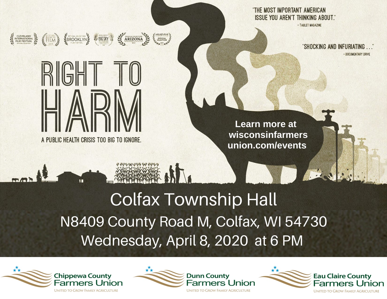 The Wisconsin Farmers Union Chippewa County Chapter, Dunn County Chapter, and Eau Claire County Chapter will present a showing of Right to Harm. A film that shows the impact of factory farming on communities throughout the US and that also includes two local Wisconsin communities.