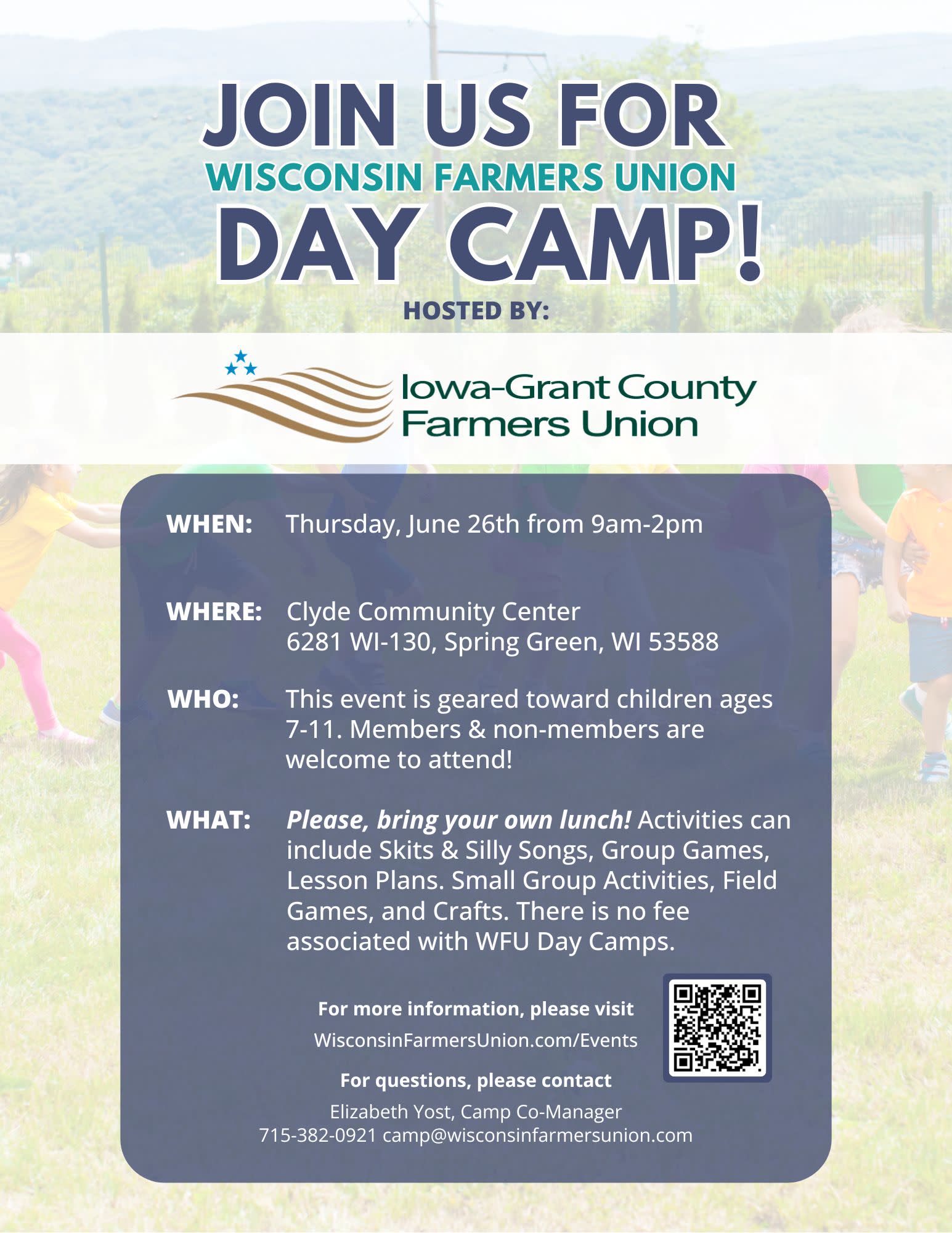 WFU Day Camps are hosted in partnership with our Kamp Kenwood summer staff, local chapters and their youth programs, and a host site. These day camps typically serve youth ages 7-11 and are a great introduction to the WFU youth program. Campers will learn about topics such as cooperation, conservation, and agriculture, all while having lots of fun playing games, exploring a farm or community space, making new friends, and practicing leadership skills.
